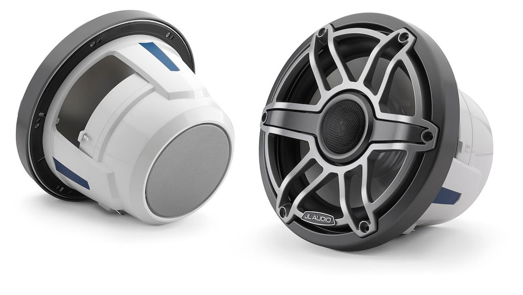 8.8 Inch Round Marine Coaxial Speaker; 125 Watts RMS Continuous Power Handling; 4 OHMS Nominal Impedance; 38 Hz Through 20 kHz Frequency Response; 90.5 Decibel System Efficiency; Mica-Filled Polypropylene; 5 Inch Mounting Depth; Gray Metallic Trim Ring/ Titanium Sport Grille; Set Of 2; With Mounting Hardware