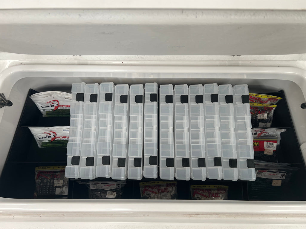 This kit gives you total tackle organization. This system consists of FOUR sections one that will hold 12 Plano boxes and 3 soft plastics trays.