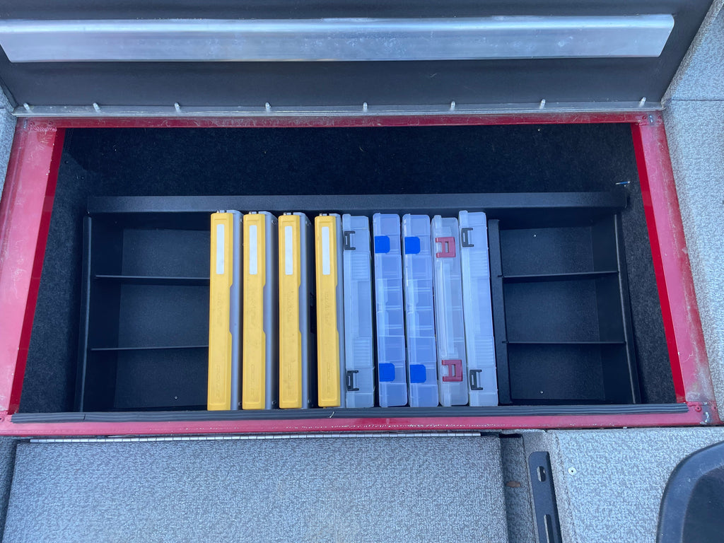 Organize your center compartment with this custom fit tray that will hold 9 Plano 3700 series boxes and soft plastics.