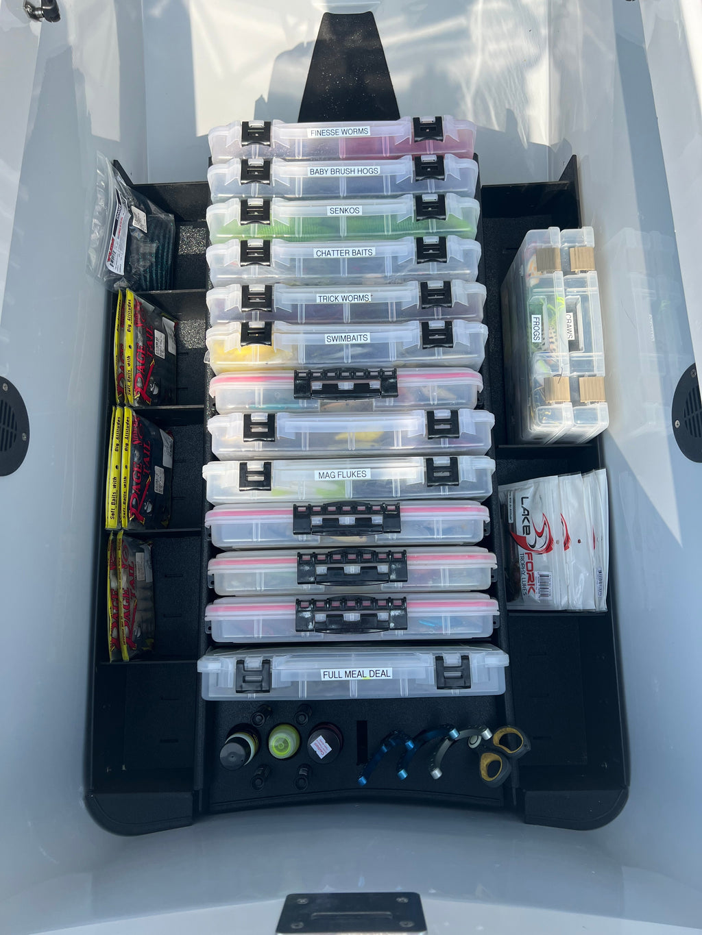 This is the perfect Tackle Management System for the iKon LX 20. This unit will hold 13 standard 3700 style trays or the dividers can be adjusted to accept the deeper 3700 trays. Has 2 side compartments to store soft plastics and the dividers are removable to customize the compartments to meet your needs. This unit locks together to make this a very clean look and install.