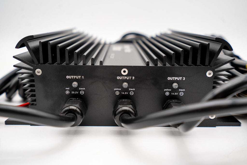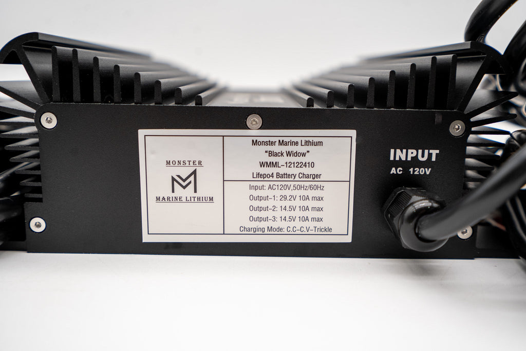 This is our custom made Triple bank lithium marine waterproof charger. It has Bank 1 for 24v lithium batteries and Bank 2 & 3 are for 12v batteries. Our new ACD (automatic charging detection) system allows our charger to work with whatever 12v batteries you have Lead/AGM or Lithium batteries! Even when running 2 of our 24v batteries in parallel, this one charger will charge both at the same time! This charger is 100% waterproof and can be mounted onboard your boat as you normally would with marine battery chargers!